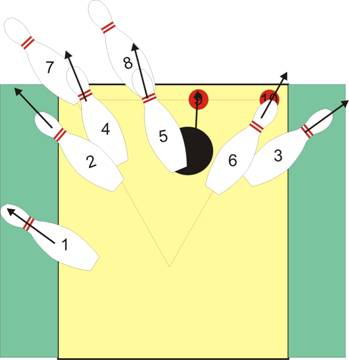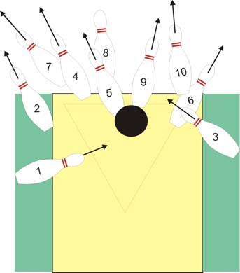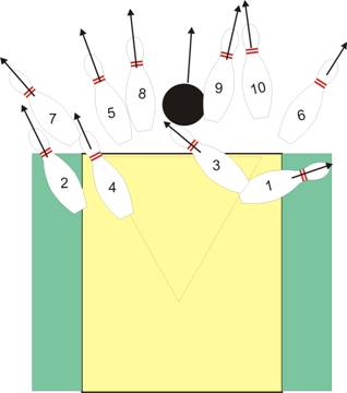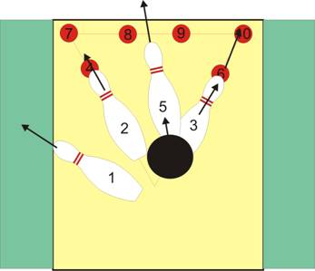 A bola reta é muito precisa, ela derruba diretamente o pino 1, ainda pega o pino 5 o pino 8, 3 e 2. O pino 3 pega o 6 e 10 e o 2 pega o 4 e 7, tudo muito preciso. Se o ângulo de entrada for mais para o 1, o pino 6 passa na frente do 10 e ele fica em pé, se o ângulo for mais para o 3, é o 4 que passa na frente do 7. Além dessas variáveis, existem outras que fica o 5, fica o 8 e o 9.