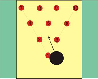 O posicionamento dos pinos de boliche na atual formação é o chamado triângulo perfeito, eqüilátero, veja a figura.