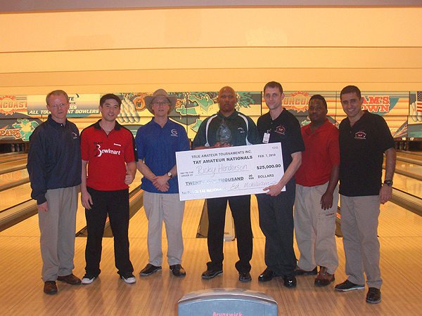 (E-D Shawn Morris (Ebonite), Joseph Guerrero, John Young, Ricky Henderson, Jamie McWilliams (TAT), Erik Glenn (Handicap Champion) e Fábio Grossi