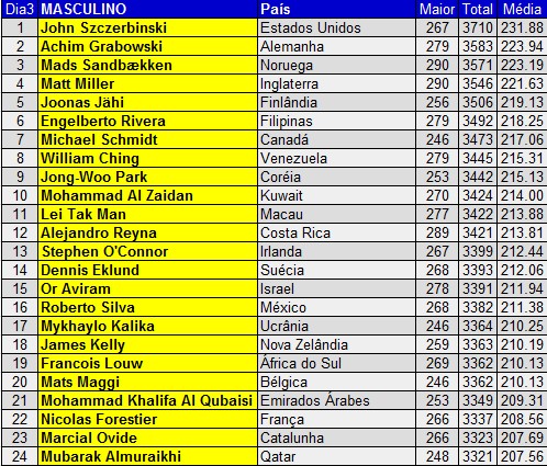 Finalizou na noite desta quinta-feira (horário de Brasília) a fase classificatória, após 16 partidas, da divisão masculina. O norte-americano John Szcerbinski manteve a liderança (3710/231,88) com 127 pontos de vantagem sobre o surpreendente vice-líder alemão, Achim Grabowski (3583/223,94). O terceiro colocado foi outra surpresa, o norueguês Mads Sandbaekken.