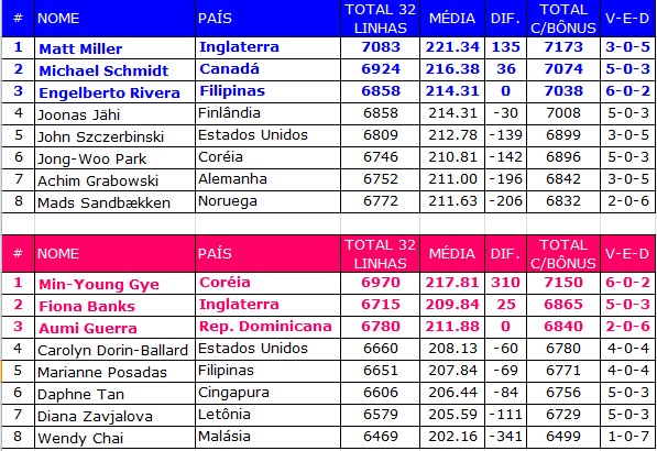 E o canadense Michael Schmidt provou de uma vez por todas que a Copa Mundial foi feita pra ele. Quando estreou em 2005 (Eslovênia) foi campeão, em 2006 (Venezuela) foi o 3.º colocado, em 2007 (Rússia) ficou em 4.º lugar, no ano passado (Malásia) foi vice-campeão. Agora já tem garantido o 3.º lugar e pode ser bicampeão. Grande figura, simpático ao extremo e excelente bowler. Parabéns, Michael, my idol!