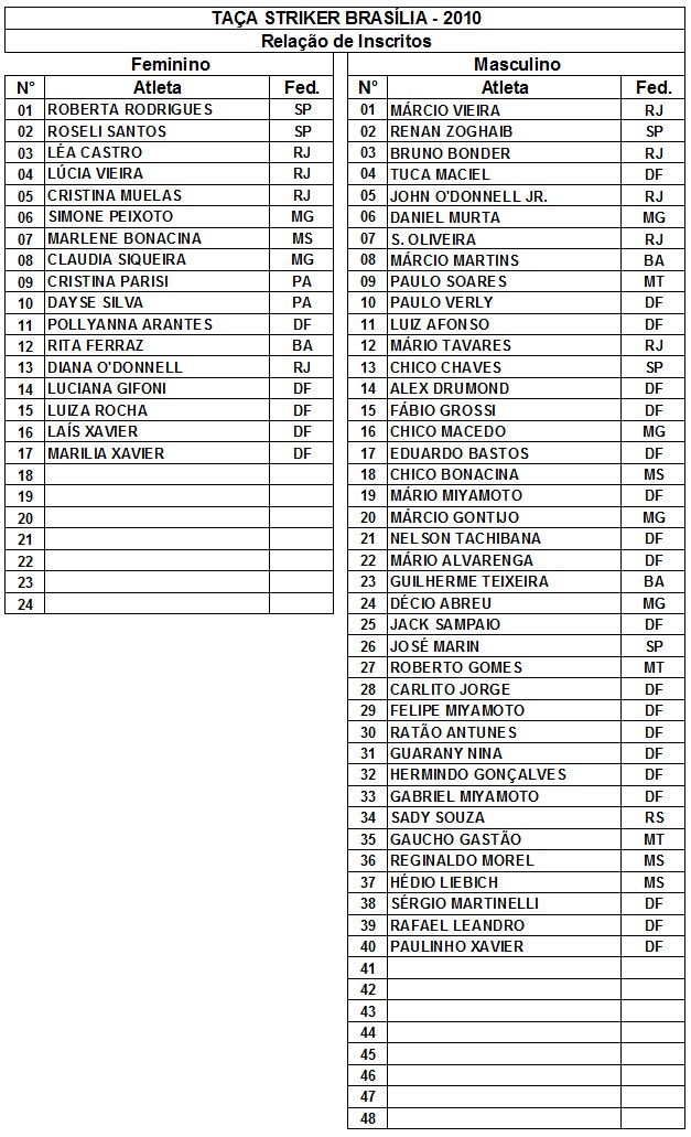 TAÇA STRIKER BRASÍLIA 2010: INSCRITOS