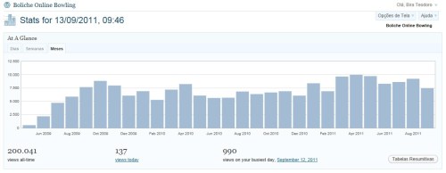 Este blog oficial do site Boliche Online foi ao ar há pouco mais que dois anos, em maio de 2009. Hoje, dia 13/09/2011, superamos a expressiva marca das 200.000 visitas acumuladas. Nos últimos meses a média mensal de visitas está muito próxima das 10.000.