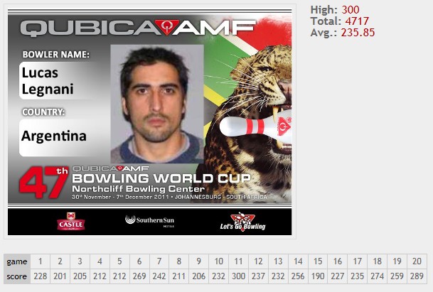 O argentino Lucas Legnani, que também fez um 300 nesta Copa Mundial, fez a maior série da rodada (1284 pontos / 256,80 de média) e ficou na 4.ª posição.