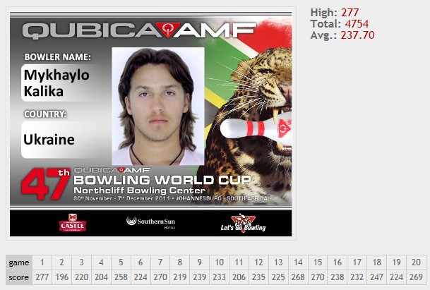 O ucraniano Mykhaylo Kalika fez uma arrancada final (238, 232, 247, 224 e 269 = 1210) e foi para o 3.º lugar.