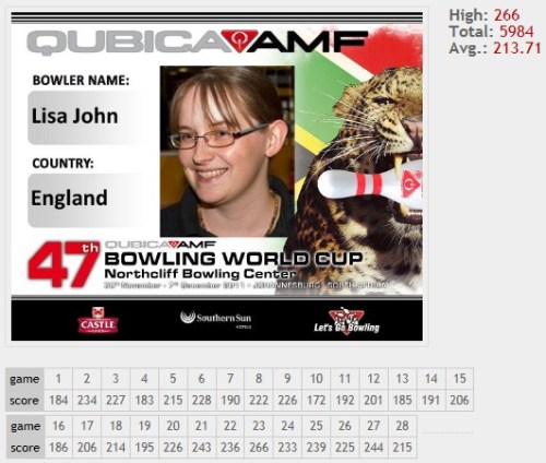 A surpresa desse grupo das oito melhores foi a inglesa Lisa John que pulou da 14.ª posição e tomou o lugar da russa Evgenya Zelenkova por apenas 4 pinos. Lisa fez 1901 pontos em 8 partidas (média de 237.62).