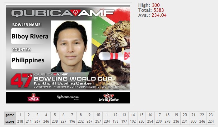 O filipino Engelberto “Biboy” Rivera, fez a quarta partida perfeita (300 pontos, 12 strikes consecutivos) nesta edição da Copa Mundial.