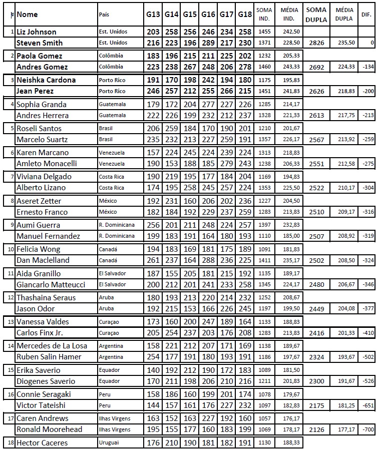O Brasil está sendo representado por Marcelo Suartz e Roseli Santos. Nesta sexta-feira, dia 11, encerraram as disputas da Fase de Duplas Mistas. Os campeões foram os norte-americanos, seguidos pelos colombianos e porto-riquenhos. A dupla brasileira chegou a liderar esta fase na segunda partida, mas não sustentou a posição e deixou de ganhar uma medalha por apenas 59 pinos.