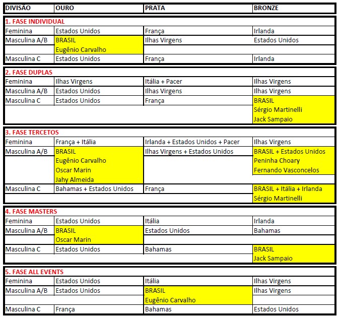 Na Fase de Tercetos o trio brasileiro formado por Eugênio Carvalho, Jahy Almeida e Oscar Marin ganhou OURO na Divisão Masculina A/B.