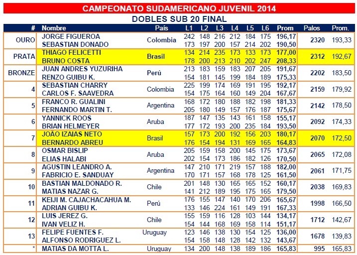 A dupla brasileira formada por Bruno Costa, ganhador da Prata na Fase Individual, e Thiago Felicetti conquistou mais uma medalha para o Brasil, a PRATA na Fase Duplas (2.212 pinos), apenas 8 pinos do Ouro (2.220 pinos) que ficou com a dupla colombiana.