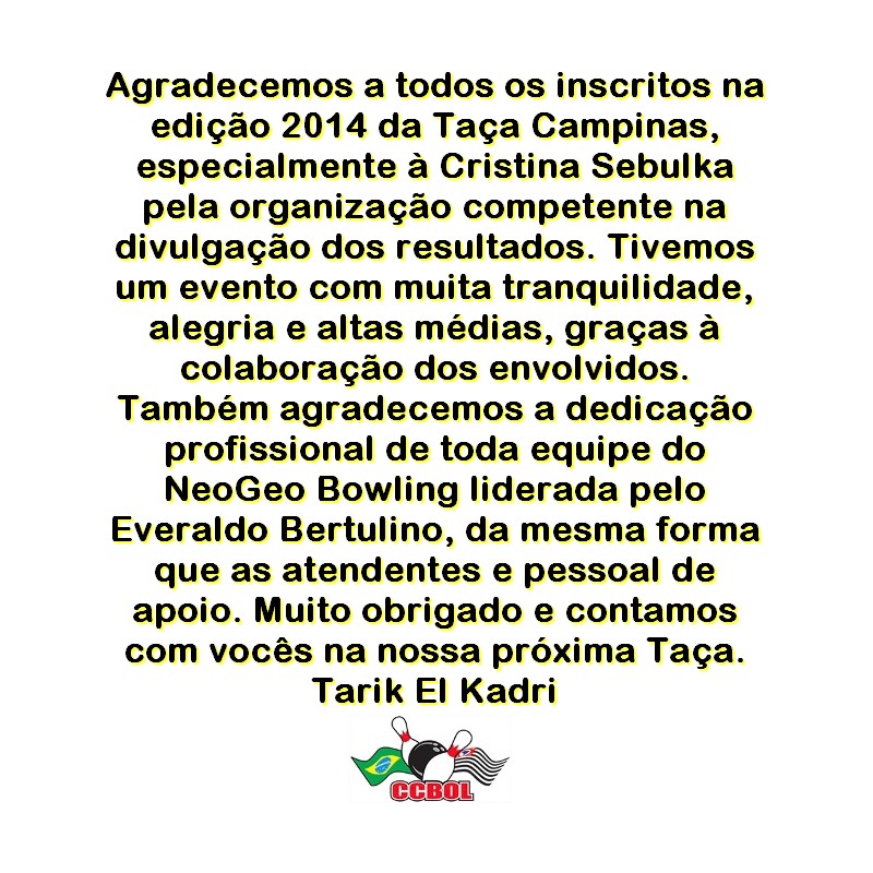 Na tarde desse domingo aconteceu a rodada final da II Taça Campinas, organizada pelo Clube Campineiro da FPBOL (Federação Paulista de Boliche).