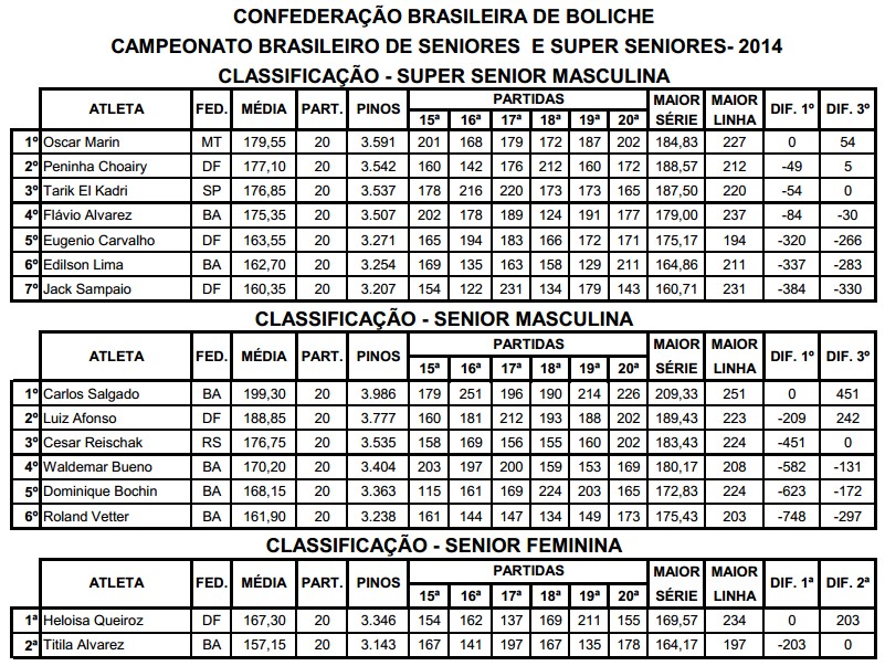 Na Divisão Sênior o baiano Carlos Salgado com 209,33 de média foi campeão 2014 com grande folga sobre Luiz Afonso (DF) e Cesar Reischek (RS).
