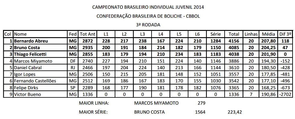 Terminou neste domingo nas pistas mineiras do Boliche Del Rey o Campeonato Brasileiro Juvenil 2014, após 20 partidas.